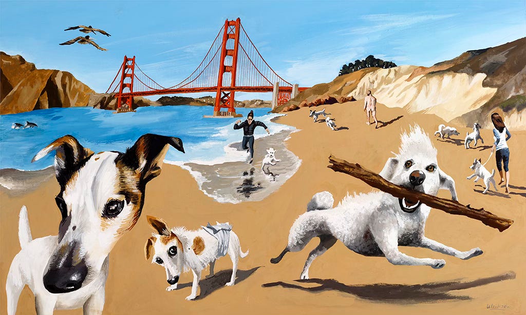 Nina and Chris once commissioned me to paint their three dogs on Baker Beach in San Francisco. The couple could be portrayed as well but subtly. I should also paint a naked dude in the scene, not uncommon at Baker Beach.