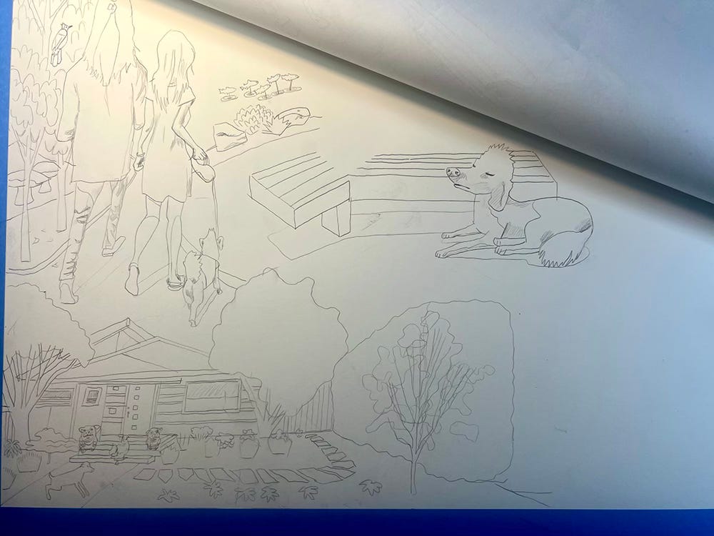 Like their initial commission this is a gouache painting. I started with the background first.